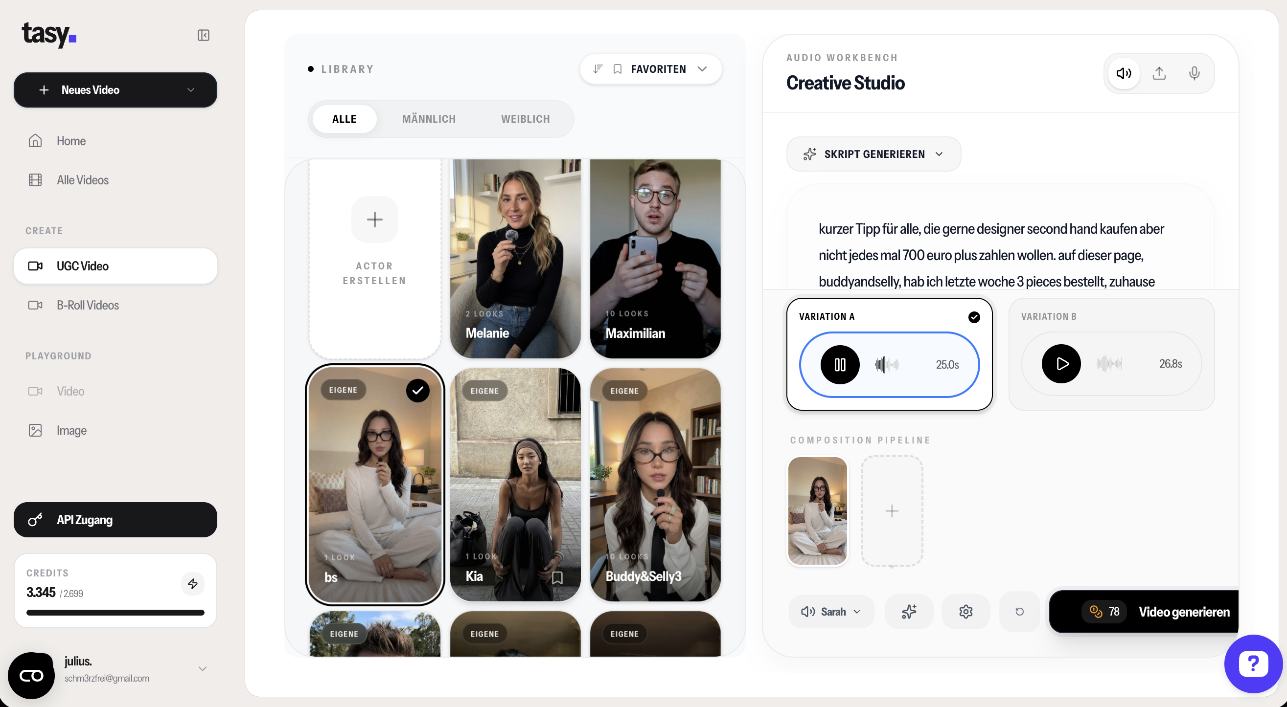 → Keine Lust auf den Stress? Probier Tasy.ai aus - erstelle unendlich viele Variationen von Avataren die dein Produkt in der Hand halten und generiere realistische Videos in 2 Minuten.